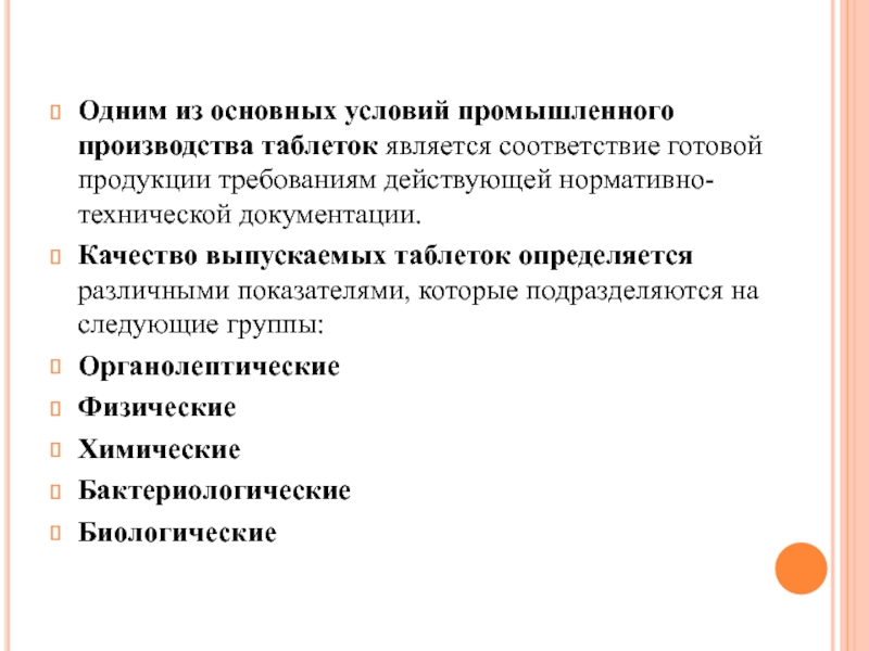 Слайд 2Одним из основных условий промышленного производства таблеток является соответствие готовой продукции требованиям действующей