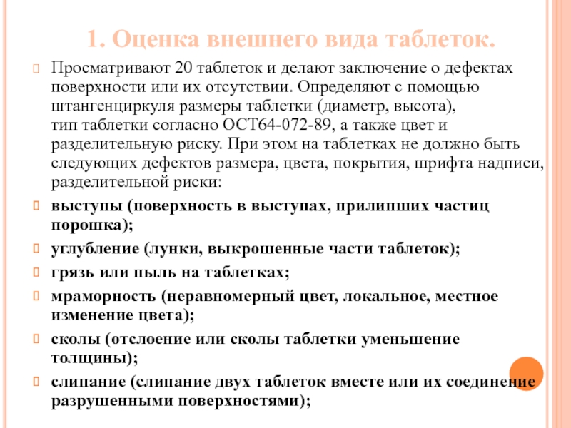 или их отсутствии. Определяют с помощью штангенциркуля размеры таблетки (диаметр, высота), тип таблетки согласно ОСТ64-072-89, а также цвет и разделительную риску. При этом на таблетках не должно быть следующих дефектов размера, цвета, покрытия, шрифта надписи, разделительной риски: