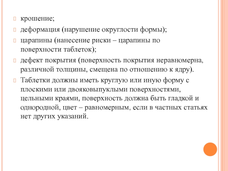 Таблетки должны иметь круглую или иную форму с плоскими или двояковыпуклыми поверхностями, цельными краями, поверхность должна быть гладкой и однородной, цвет – равномерным, если в частных статьях нет других указаний.