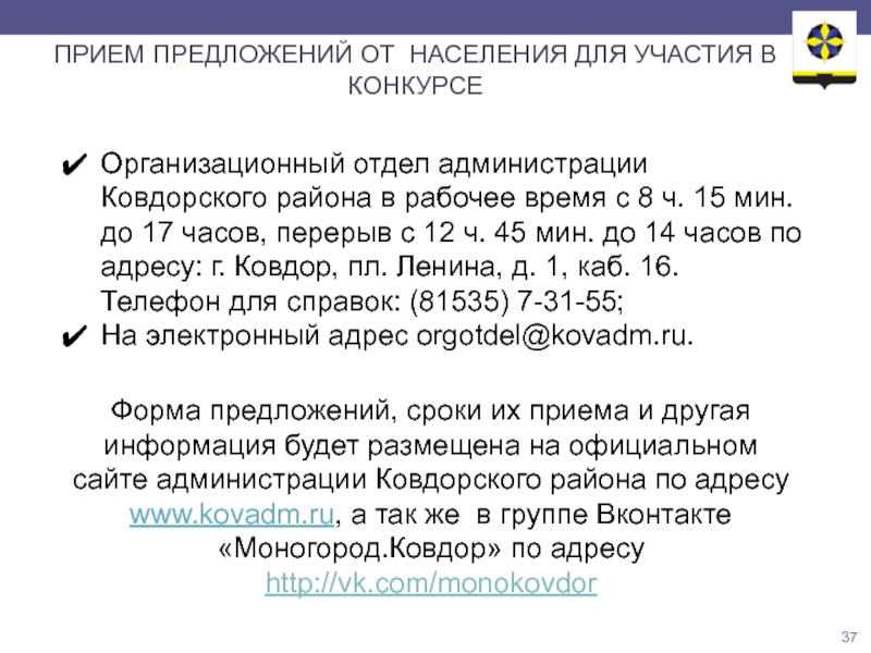 Форма предложений, сроки их приема и другая информация будет размещена на официальном сайте администрации Ковдорского района по адресу www.kovadm.ru, а так же в группе Вконтакте «Моногород.Ковдор» по адресу http://vk.com/monokovdor