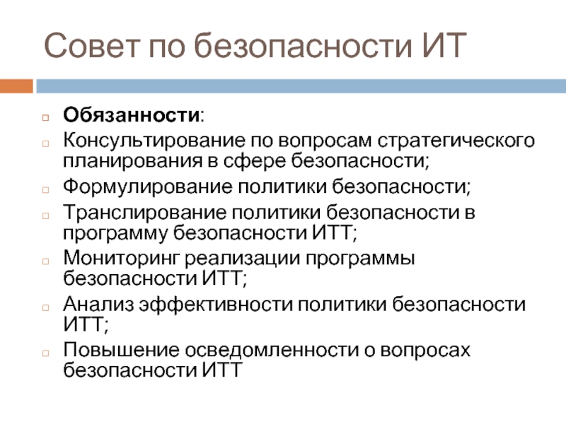 Транслирование политики безопасности в программу безопасности ИТТ;