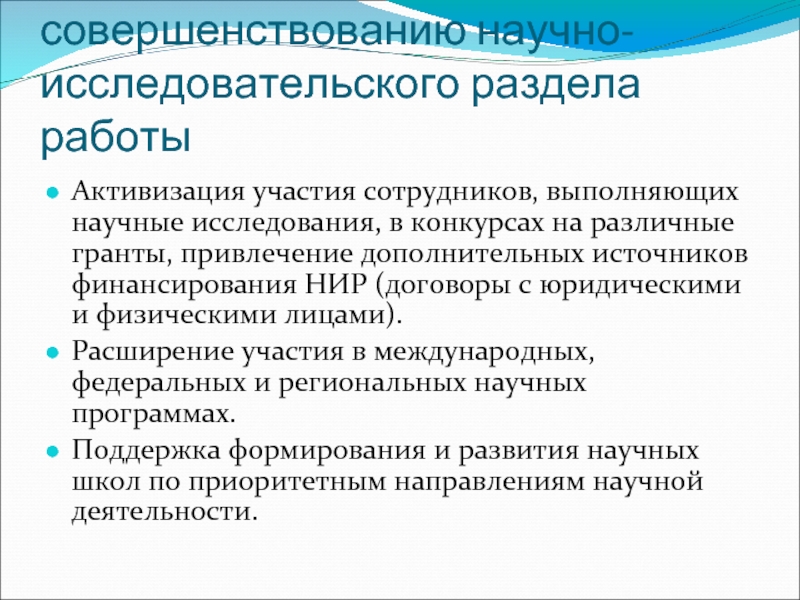 Слайд 13Необходимые мероприятия по совершенствованию научно-исследовательского раздела работы