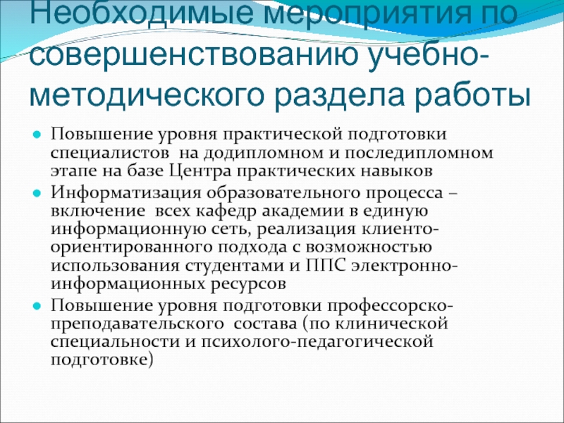 Слайд 8Необходимые мероприятия по совершенствованию учебно-методического раздела работы