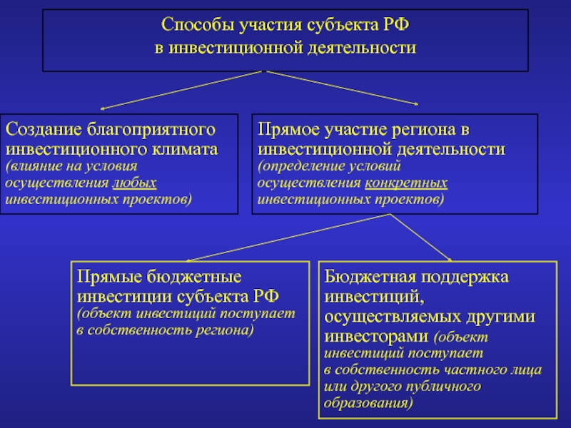 3.  Перечень оснований для бюджетных вложений в уставный капитал юридических лиц ограничен кругом оснований, установленных для создания ГУПов. (Причины: регион принимает риск убытков; конфликт между обязанностью государства поддерживать конкуренцию и особой заинтересованностью в деятельности отдельных хозяйствующих субъектов).