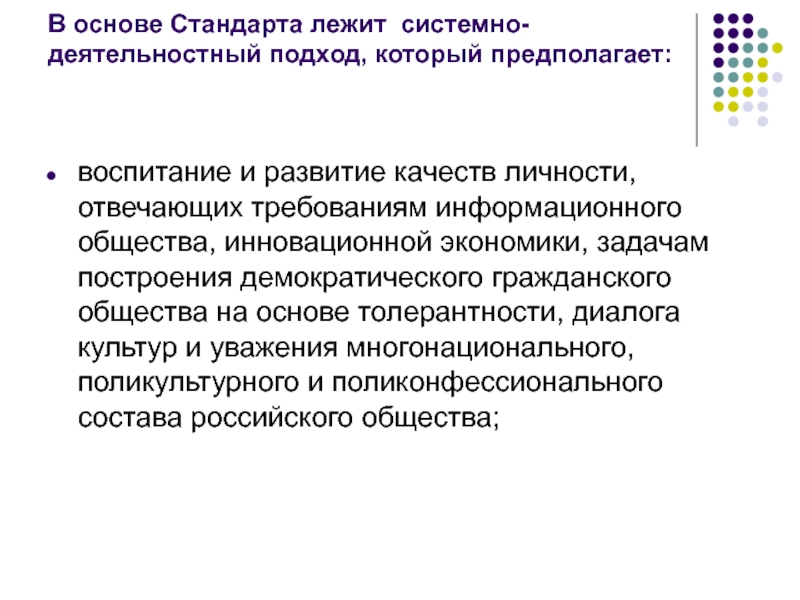Слайд 12В основе Стандарта лежит системно-деятельностный подход, который предполагает: