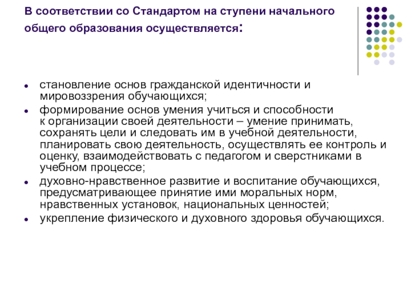 Слайд 18В соответствии со Стандартом на ступени начального общего образования осуществляется: