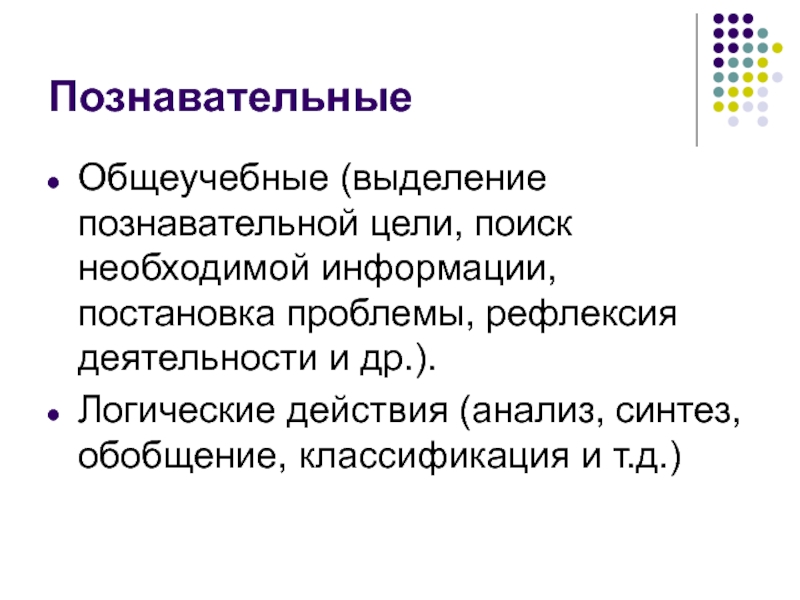 Общеучебные (выделение познавательной цели, поиск необходимой информации, постановка проблемы, рефлексия деятельности