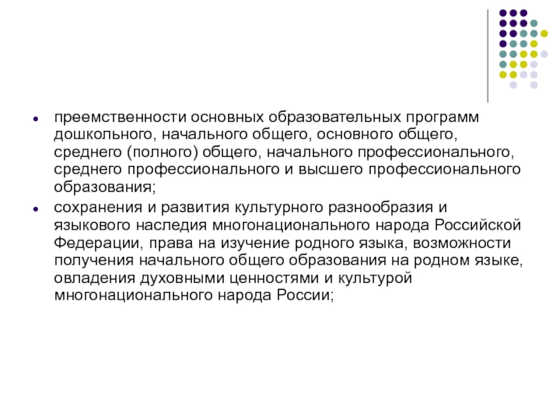 сохранения и развития культурного разнообразия и языкового наследия многонационального народа Российской Федерации, права на изучение родного языка, возможности получения начального общего образования на родном языке, овладения духовными ценностями и культурой многонационального народа России;