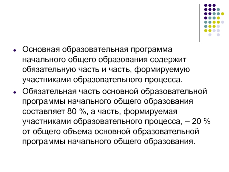 Обязательная часть основной образовательной программы начального общего образования составляет 80 %, а часть, формируемая участниками образовательного процесса, – 20 % от общего объема основной образовательной программы начального общего образования.