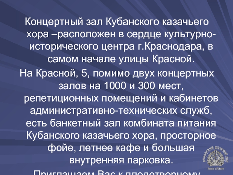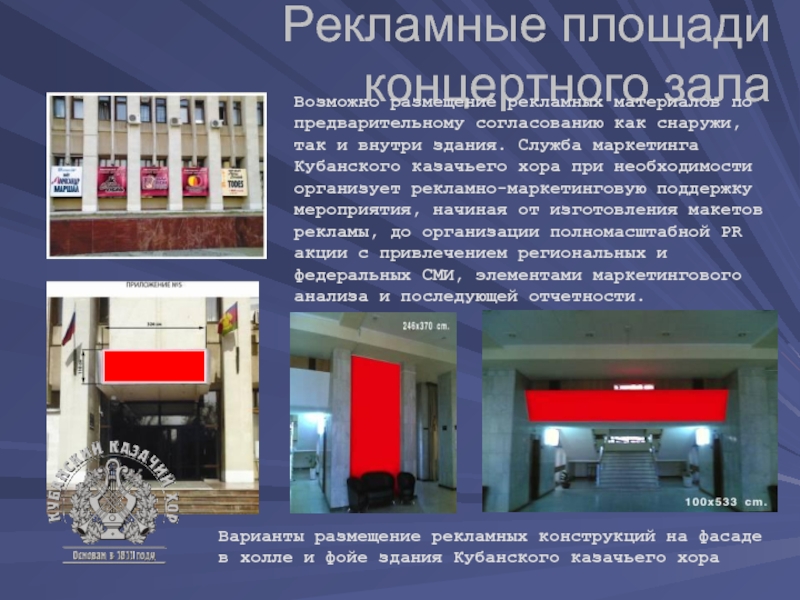 Возможно размещение рекламных материалов по предварительному согласованию как снаружи, так и внутри здания. Служба маркетинга Кубанского казачьего хора при необходимости организует рекламно-маркетинговую поддержку мероприятия, начиная от изготовления макетов рекламы, до организации полномасштабной PR акции с привлечением региональных и федеральных СМИ, элементами маркетингового анализа и последующей отчетности.