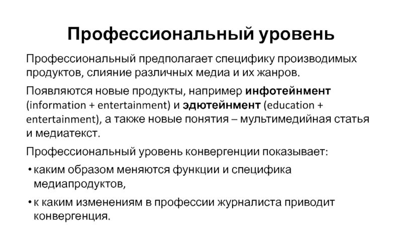 Профессиональный предполагает специфику производимых продуктов, слияние различных медиа и их