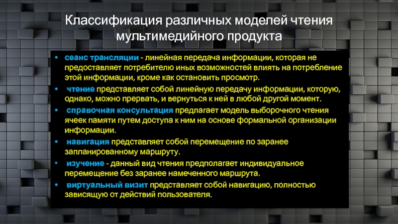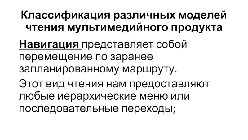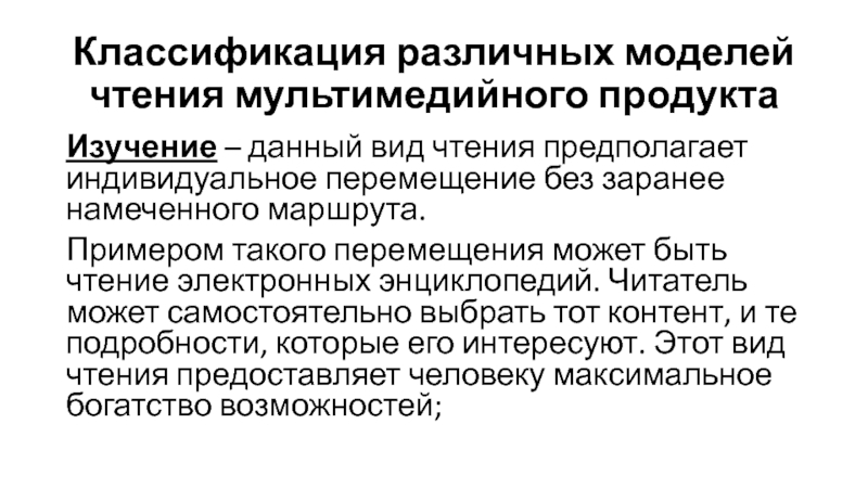 Примером такого перемещения может быть чтение электронных энциклопедий. Читатель может самостоятельно выбрать тот контент, и те подробности, которые его интересуют. Этот вид чтения предоставляет человеку максимальное богатство возможностей;