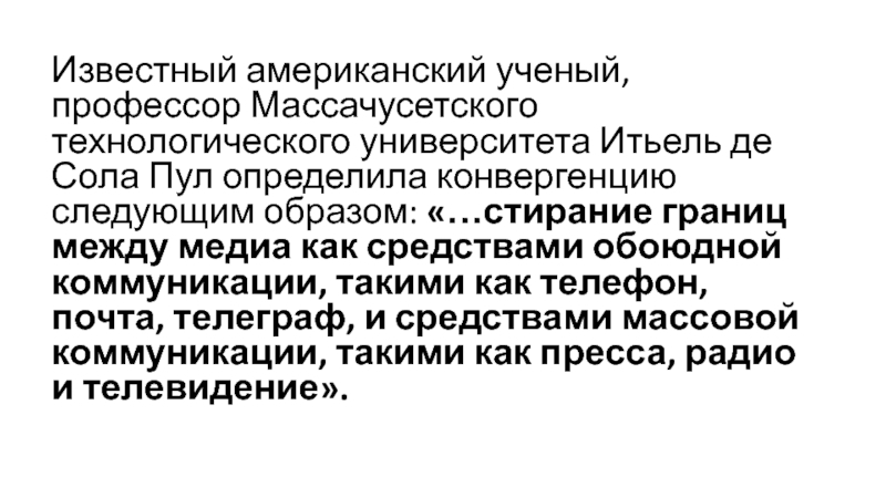 определила конвергенцию следующим образом: «…стирание границ между медиа как средствами обоюдной коммуникации, такими как телефон, почта, телеграф, и средствами массовой коммуникации, такими как пресса, радио и телевидение».