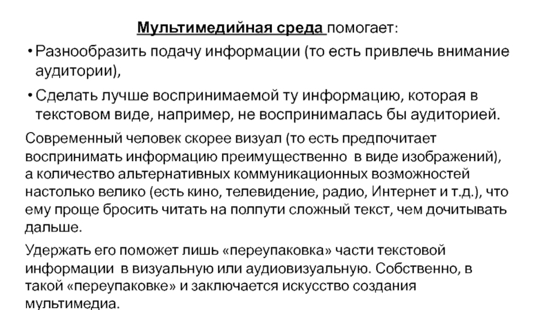 Удержать его поможет лишь «переупаковка» части текстовой информации в визуальную или аудиовизуальную. Собственно, в такой «переупаковке» и заключается искусство создания мультимедиа.