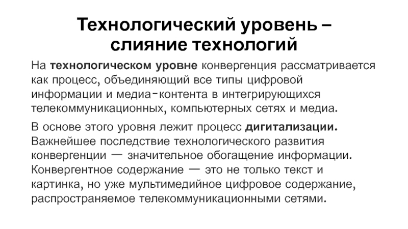 В основе этого уровня лежит процесс дигитализации. Важнейшее последствие технологического развития конвергенции — значительное обогащение информации. Конвергентное содержание — это не только текст и картинка, но уже мультимедийное цифровое содержание, распространяемое телекоммуникационными сетями.