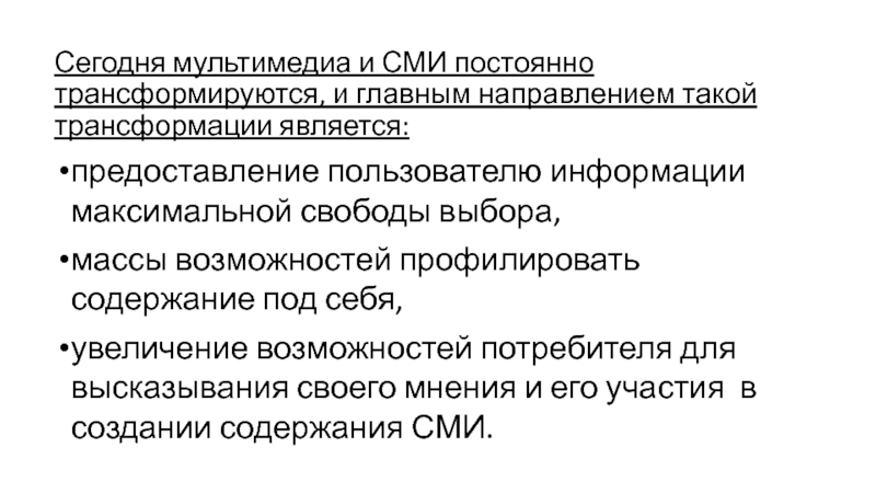 Слайд 62Сегодня мультимедиа и СМИ постоянно трансформируются, и главным направлением такой трансформации