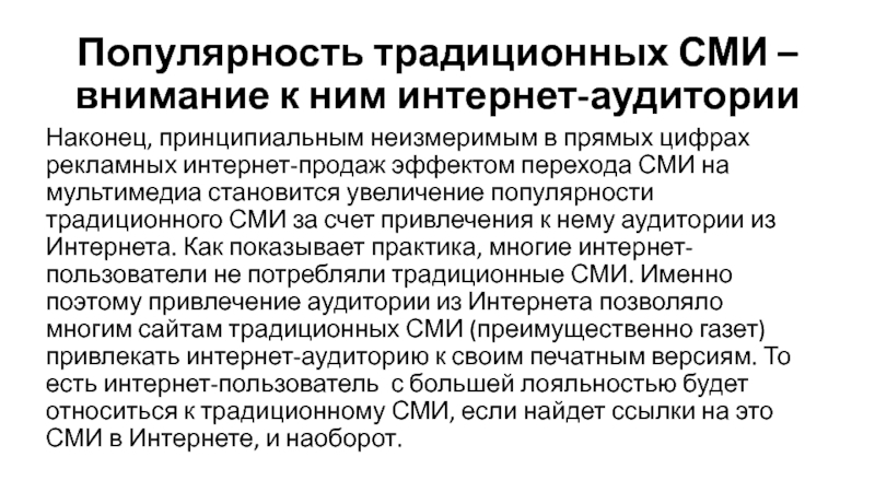 прямых цифрах рекламных интернет-продаж эффектом перехода СМИ на мультимедиа становится увеличение популярности традиционного СМИ за счет привлечения к нему аудитории из Интернета. Как показывает практика, многие интернет-пользователи не потребляли традиционные СМИ. Именно поэтому привлечение аудитории из Интернета позволяло многим сайтам традиционных СМИ (преимущественно газет) привлекать интернет-аудиторию к своим печатным версиям. То есть интернет-пользователь с большей лояльностью будет относиться к традиционному СМИ, если найдет ссылки на это СМИ в Интернете, и наоборот.