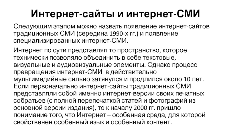 Интернет по сути представлял то пространство, которое технически позволяло объединить в себе текстовые, визуальные и аудиовизуальные элементы. Однако процесс превращения интернет-СМИ в действительно мультимедийные сильно затянулся и продлился около 10 лет. Если первоначально интернет-сайты традиционных СМИ представляли собой именно интернет-версии своих печатных собратьев (с полной перепечаткой статей и фотографий из основной версии издания), то к началу 2000 гг. пришло понимание того, что Интернет – особенная среда, для которой свойственен особенный язык и особенный контент.