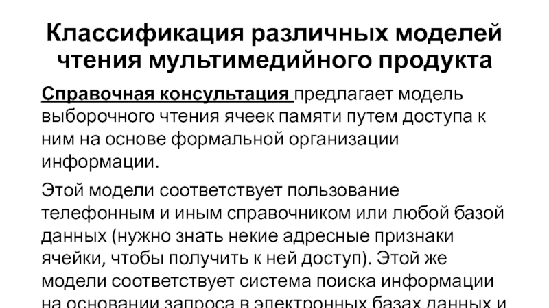 Этой модели соответствует пользование телефонным и иным справочником или любой базой данных (нужно знать некие адресные признаки ячейки, чтобы получить к ней доступ). Этой же модели соответствует система поиска информации на основании запроса в электронных базах данных и поисковых машинах;