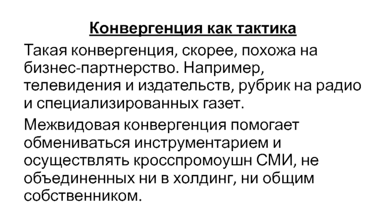 Однако термин «конвергенция» намного шире, т. к. включает в себя несколько аспектов – технологический, экономический, организационный и т. д.