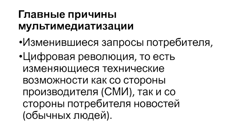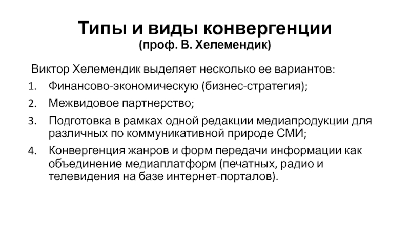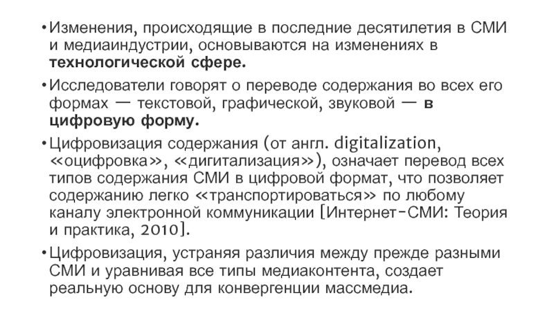 Цифровизация, устраняя различия между прежде разными СМИ и уравнивая все типы медиаконтента, создает реальную основу для конвергенции массмедиа.