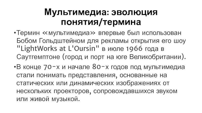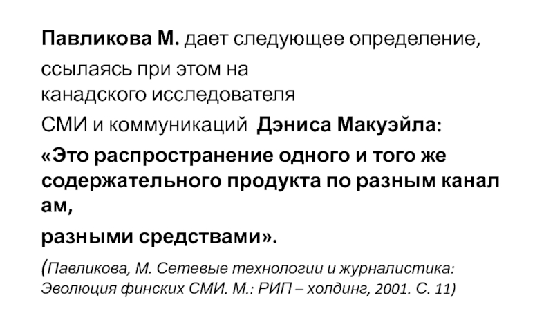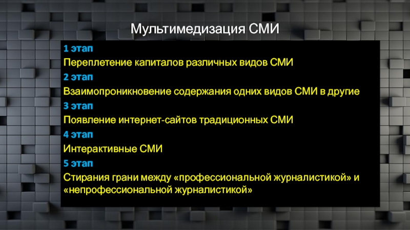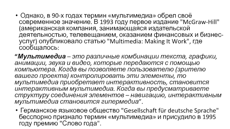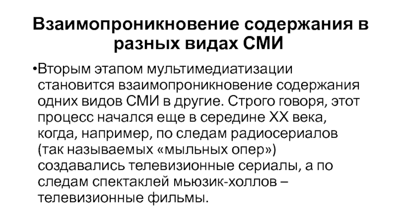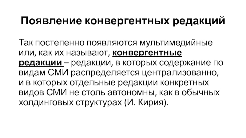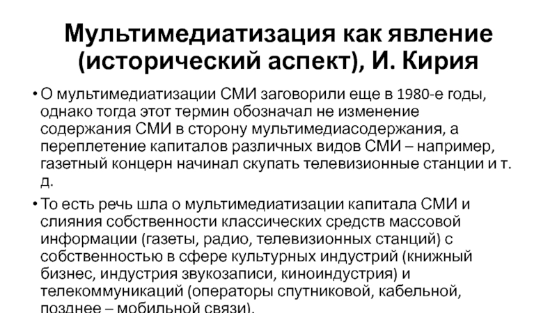 в 1980-е годы, однако тогда этот термин обозначал не изменение содержания СМИ в сторону мультимедиасодержания, а переплетение капиталов различных видов СМИ – например, газетный концерн начинал скупать телевизионные станции и т.д.