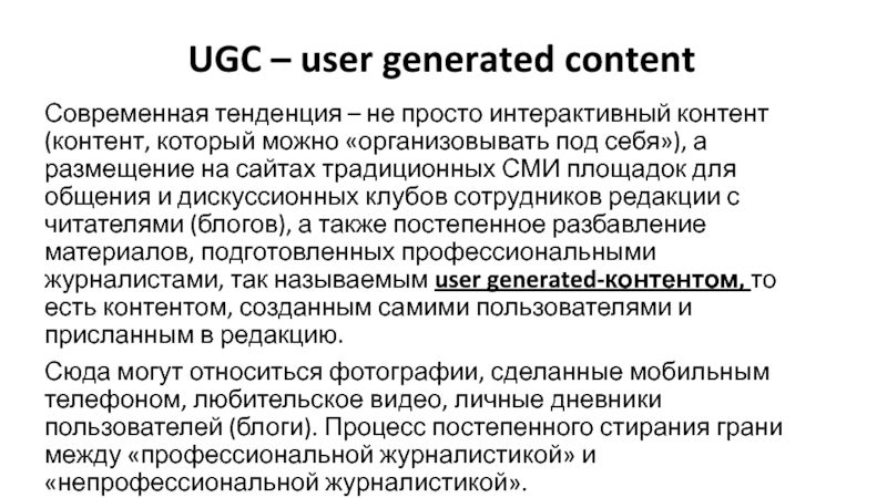 (контент, который можно «организовывать под себя»), а размещение на сайтах традиционных СМИ площадок для общения и дискуссионных клубов сотрудников редакции с читателями (блогов), а также постепенное разбавление материалов, подготовленных профессиональными журналистами, так называемым user generated-контентом, то есть контентом, созданным самими пользователями и присланным в редакцию.