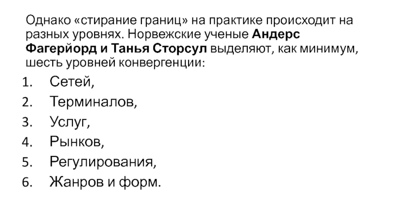 Андерс Фагерйорд и Танья Сторсул выделяют, как минимум, шесть уровней конвергенции: