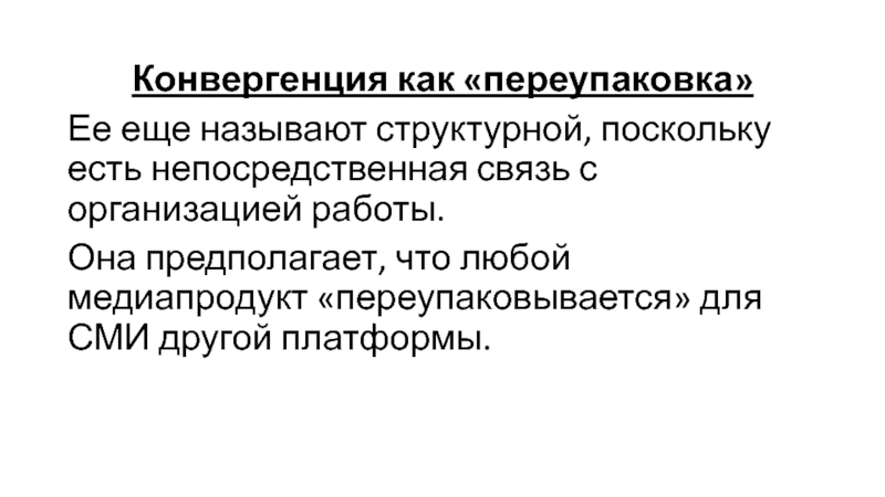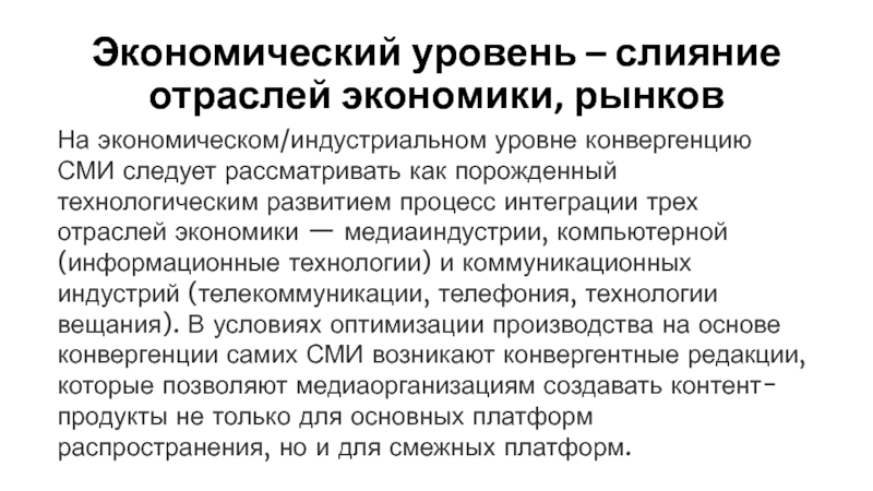 следует рассматривать как порожденный технологическим развитием процесс интеграции трех отраслей экономики — медиаиндустрии, компьютерной (информационные технологии) и коммуникационных индустрий (телекоммуникации, телефония, технологии вещания). В условиях оптимизации производства на основе конвергенции самих СМИ возникают конвергентные редакции, которые позволяют медиаорганизациям создавать контент-продукты не только для основных платформ распространения, но и для смежных платформ.