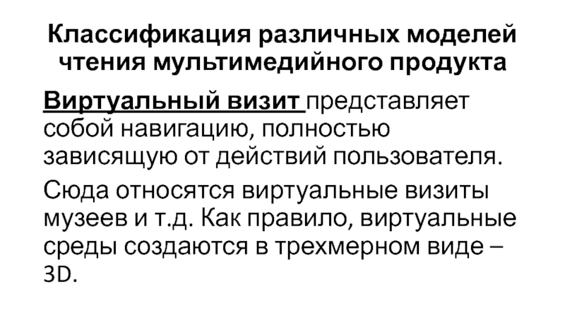 Сюда относятся виртуальные визиты музеев и т.д. Как правило, виртуальные среды создаются в трехмерном виде – 3D.