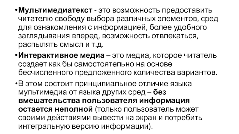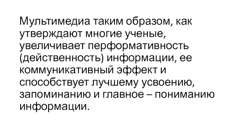 Слайд 46Мультимедиа таким образом, как утверждают многие ученые, увеличивает перформативность (действенность) информации,