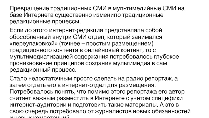 Если до этого интернет-редакция представляла собой обособленный внутри СМИ отдел, который занимался «переупаковкой» (точнее – простым размещением) традиционного контента в онлайновый контент, то с мультимедиатизацией содержания потребовалось глубокое проникновение принципов создания мультимедиа в сам редакционный процесс.