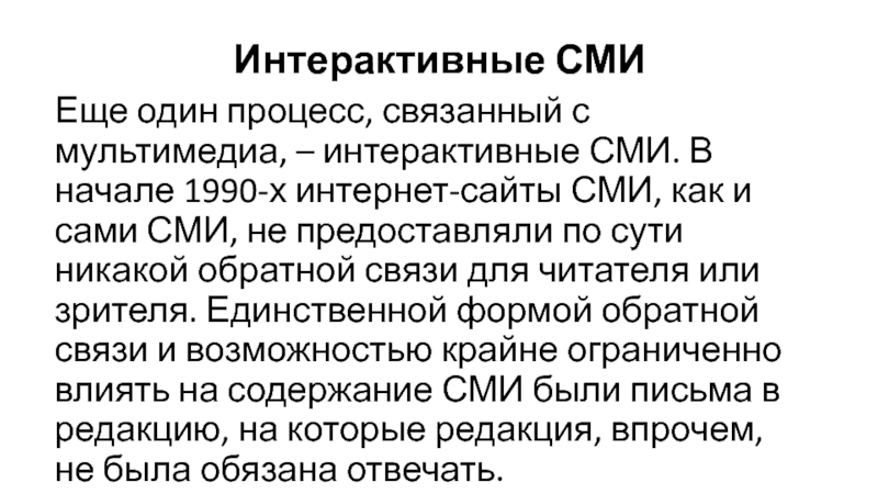 Еще один процесс, связанный с мультимедиа, – интерактивные СМИ. В