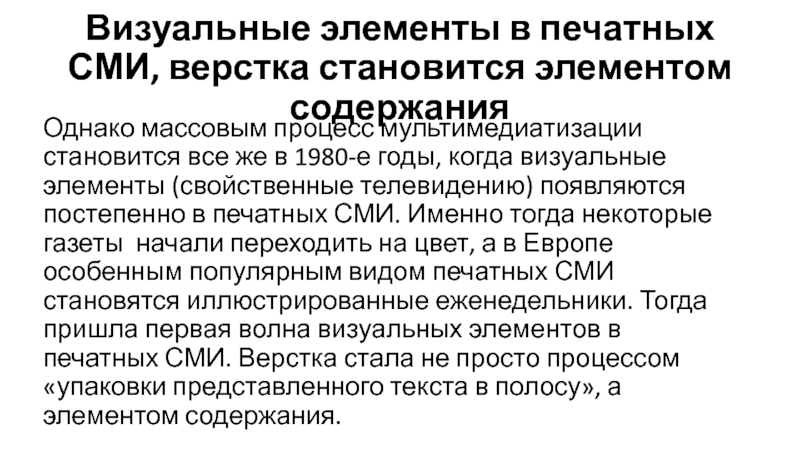 мультимедиатизации становится все же в 1980-е годы, когда визуальные элементы (свойственные телевидению) появляются постепенно в печатных СМИ. Именно тогда некоторые газеты начали переходить на цвет, а в Европе особенным популярным видом печатных СМИ становятся иллюстрированные еженедельники. Тогда пришла первая волна визуальных элементов в печатных СМИ. Верстка стала не просто процессом «упаковки представленного текста в полосу», а элементом содержания.