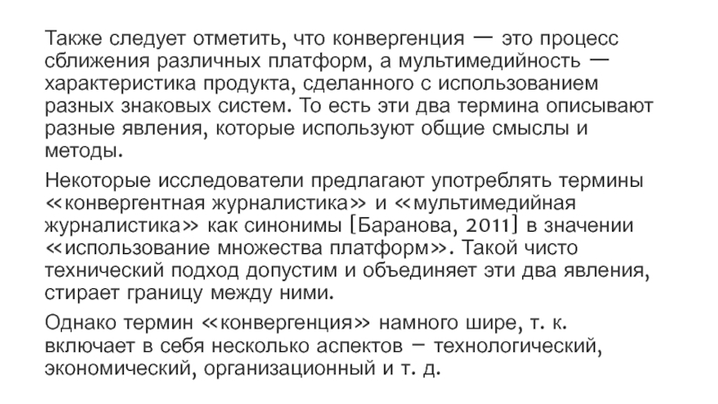 Некоторые исследователи предлагают употреблять термины «конвергентная журналистика» и «мультимедийная журналистика» как синонимы [Баранова, 2011] в значении «использование множества платформ». Такой чисто технический подход допустим и объединяет эти два явления, стирает границу между ними.
