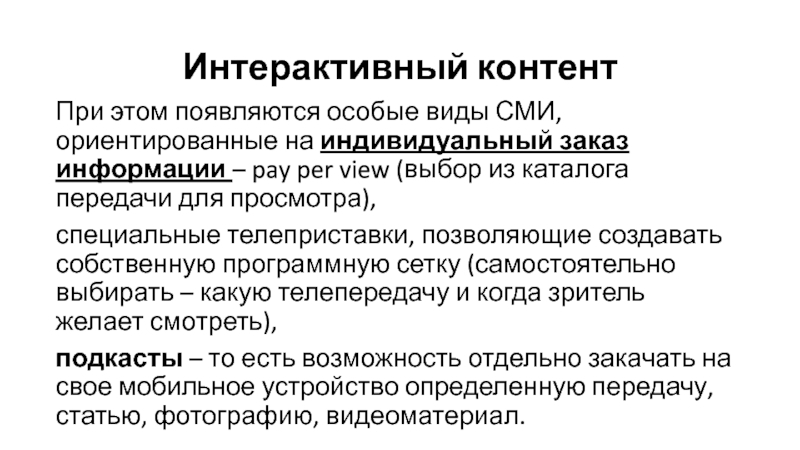 При этом появляются особые виды СМИ, ориентированные на индивидуальный заказ