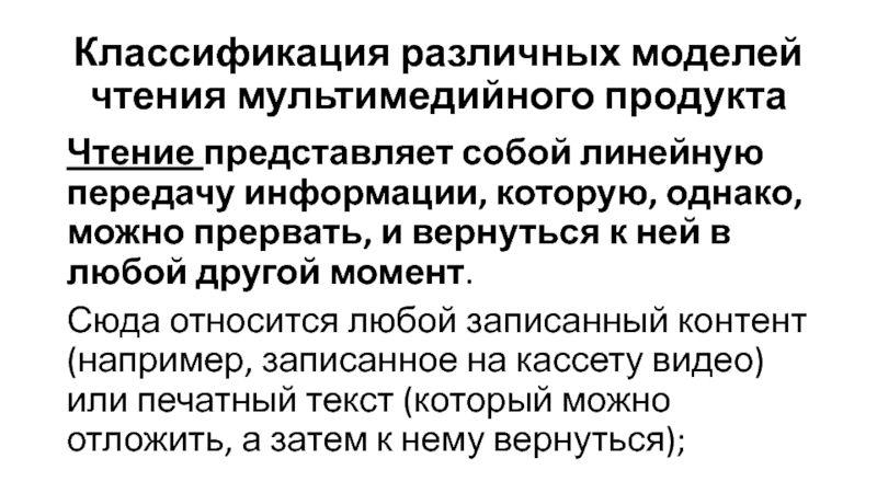 Сюда относится любой записанный контент (например, записанное на кассету видео) или печатный текст (который можно отложить, а затем к нему вернуться);