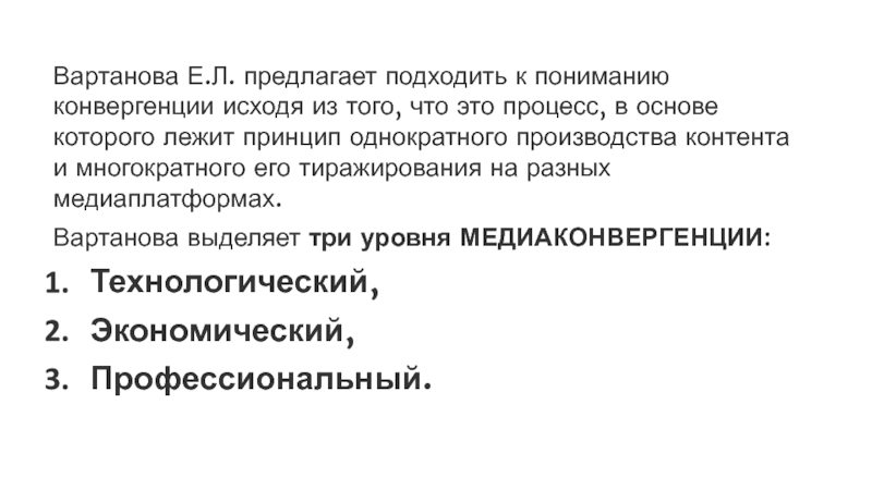 Вартанова выделяет три уровня МЕДИАКОНВЕРГЕНЦИИ: