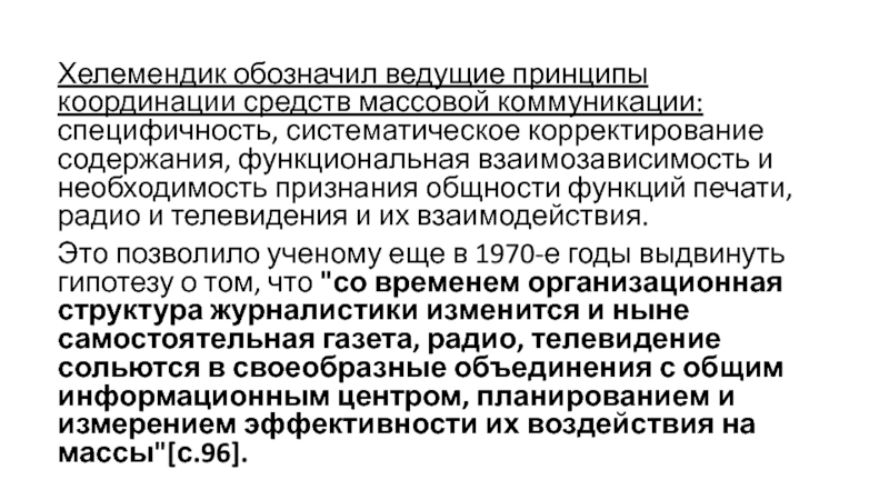 Хелемендик обозначил ведущие принципы координации средств массовой коммуникации: специфичность, систематическое корректирование