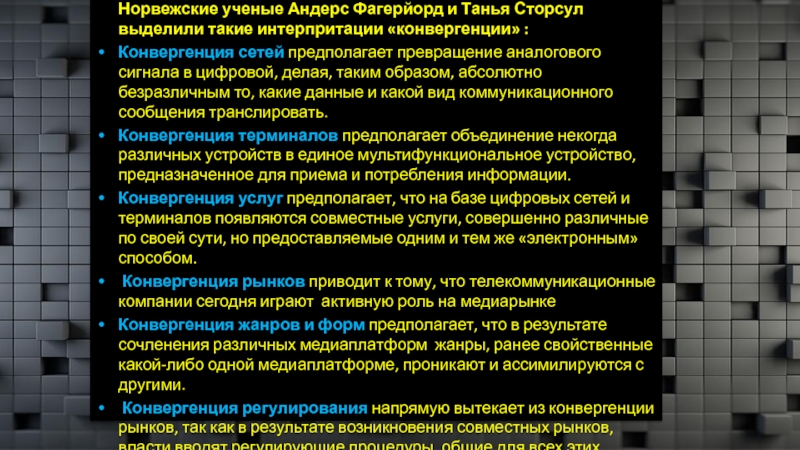 используется для обозначения взаимодействия и объединения различных каналов и средств связи в условиях развития мультимедийных процессов и информационных супермагистралей, совершающихся благодаря широкому внедрению новых технологий, обеспечивающих применение цифровой трансмиссии информации в коммутирующихся телекомпьютерных и телефонно- кабельных линиях» (Землянова, Коммуникативистика и средства информации: