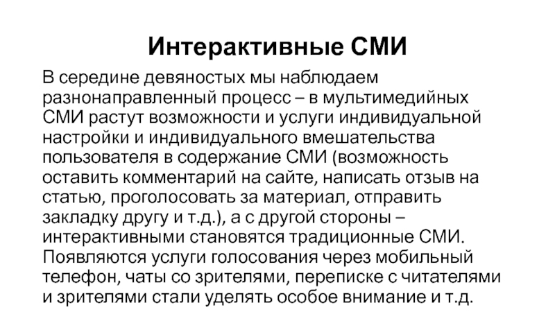 СМИ растут возможности и услуги индивидуальной настройки и индивидуального вмешательства пользователя в содержание СМИ (возможность оставить комментарий на сайте, написать отзыв на статью, проголосовать за материал, отправить закладку другу и т.д.), а с другой стороны – интерактивными становятся традиционные СМИ. Появляются услуги голосования через мобильный телефон, чаты со зрителями, переписке с читателями и зрителями стали уделять особое внимание и т.д.