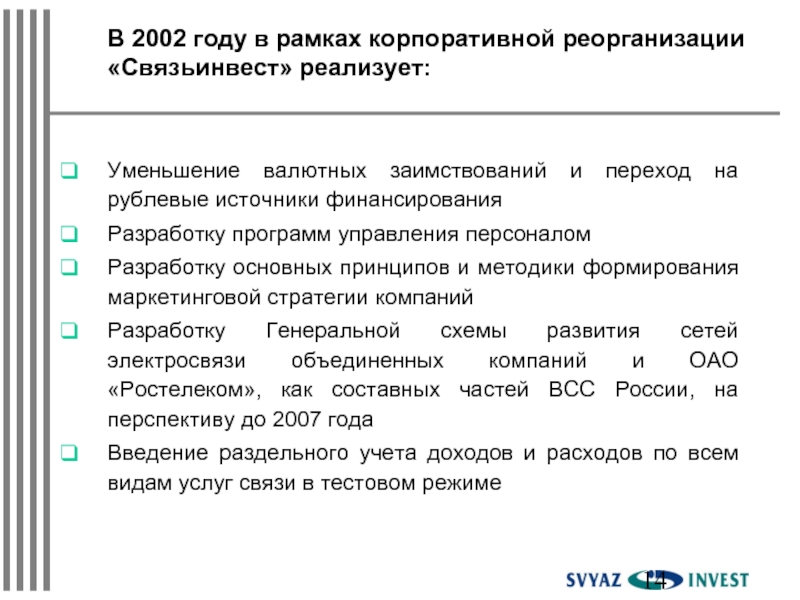 В 2002 году в рамках корпоративной реорганизации «Связьинвест» реализует: