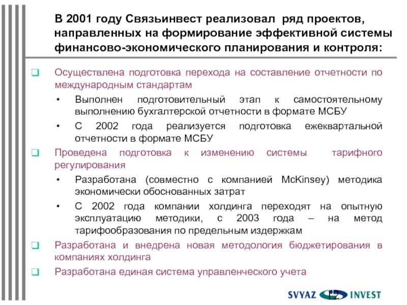 В 2001 году в холдинге Связьинвест началось внедрение системы бюджетирования и инвестиционного планирования