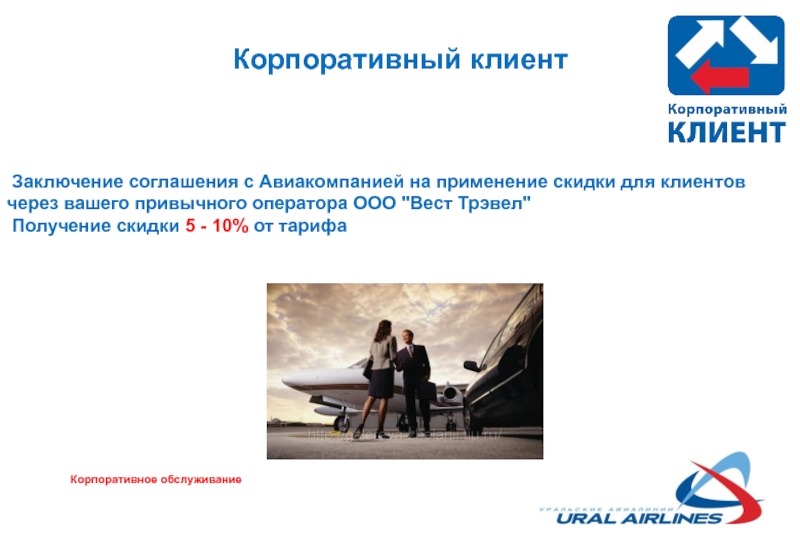 КОРПОРАТИВНОЕ ОБСЛУЖИВАНИЕ Корпоративный клиент 3-х сторонний договор Скидки (специальный тариф) Финансовая отчетность для возмещения НДС Свободная регистрация. презентация