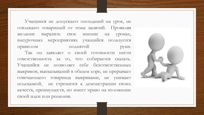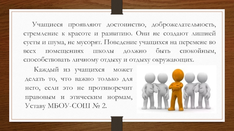 Учащиеся проявляют достоинство, доброжелательность, стремление к красоте и развитию. Они не создают лишней суеты и шума, не мусорят. Поведение учащихся на перемене во всех помещениях школы должно быть спокойным, способствовать личному отдыху и отдыху окружающих.
