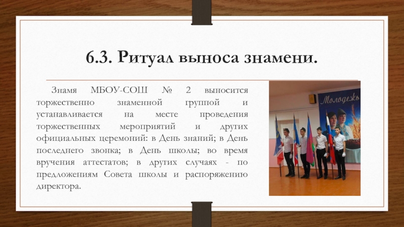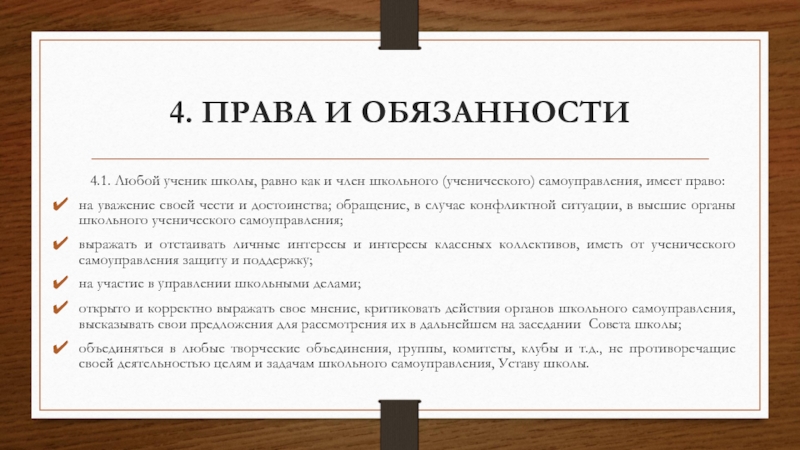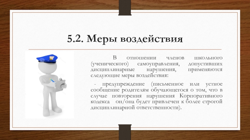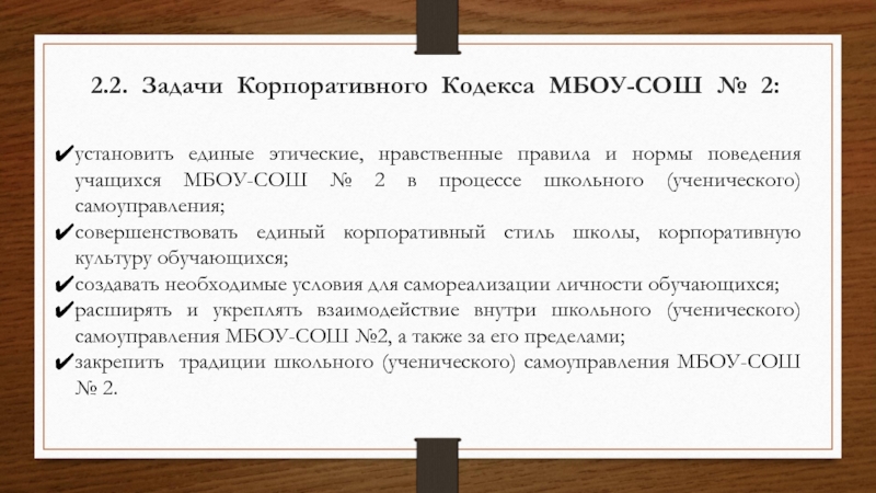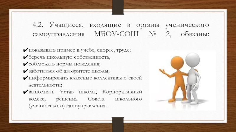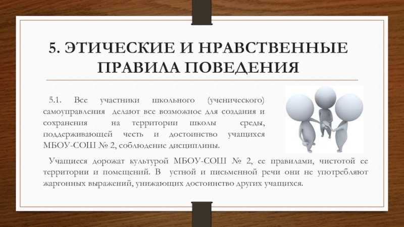 5.1. Все участники школьного (ученического) самоуправления делают все возможное для создания и сохранения на территории школы среды, поддерживающей честь и достоинство учащихся МБОУ-СОШ № 2, соблюдение дисциплины.