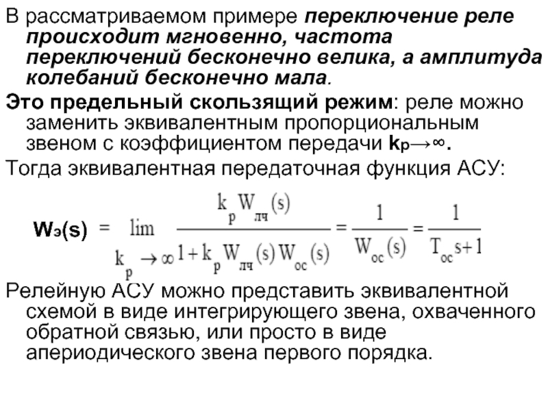 Это предельный скользящий режим: реле можно заменить эквивалентным пропорциональным звеном с коэффициентом передачи kp→∞.