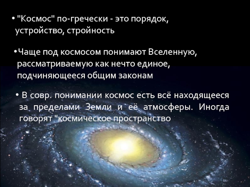 Чаще под космосом понимают Вселенную, рассматриваемую как нечто единое, подчиняющееся общим законам