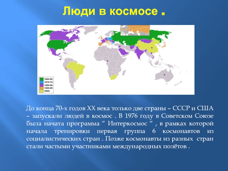 века только две страны – СССР и США – запускали людей в космос . В 1976 году в Советском Союзе была начата программа “ Интеркосмос “ , в рамках которой начала тренировки первая группа 6 космонавтов из социалистических стран . Позже космонавты из разных стран стали частыми участниками международных полётов .