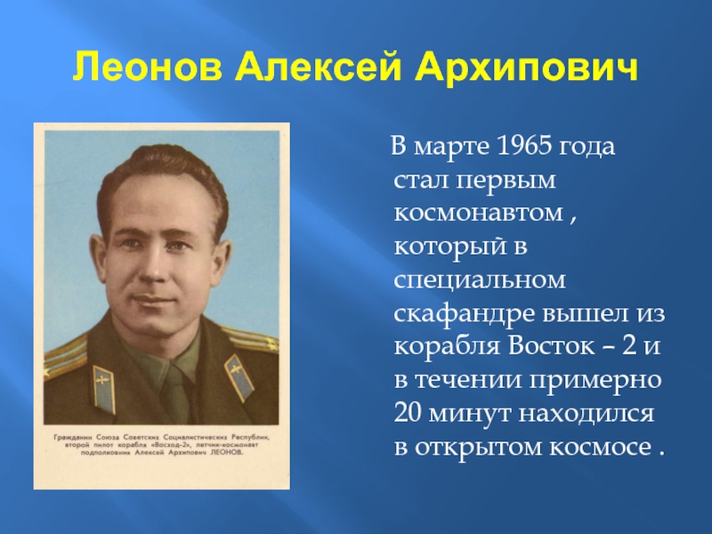 , который в специальном скафандре вышел из корабля Восток – 2 и в течении примерно 20 минут находился в открытом космосе .